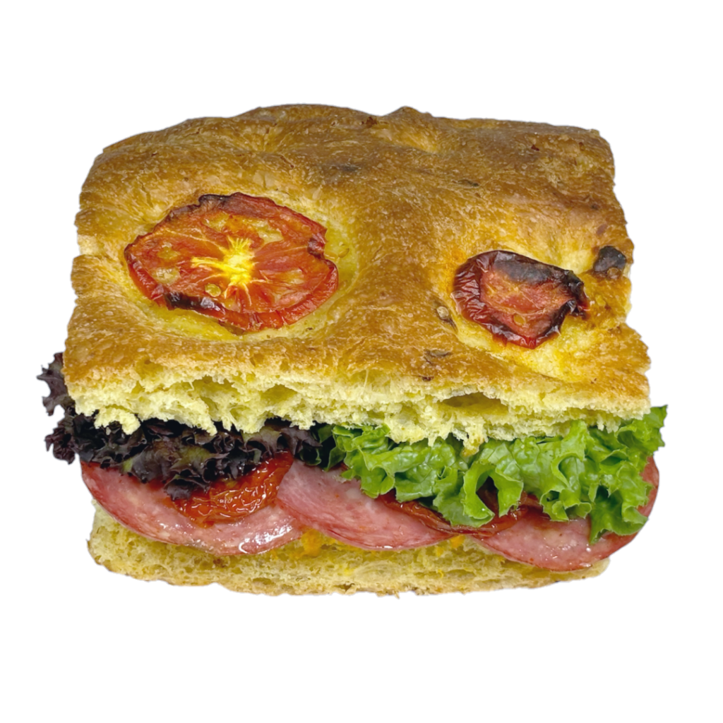 پپرونی، پنیر چدار، کاهو فرانسوی، گوجه خشک طعم دار شده و نان فوکوچیا با خمیر ترش چند ساله به همراه روغن زیتون،رزماری و ادویه مخصوص و ... همراه سس دودی و چیلی تای