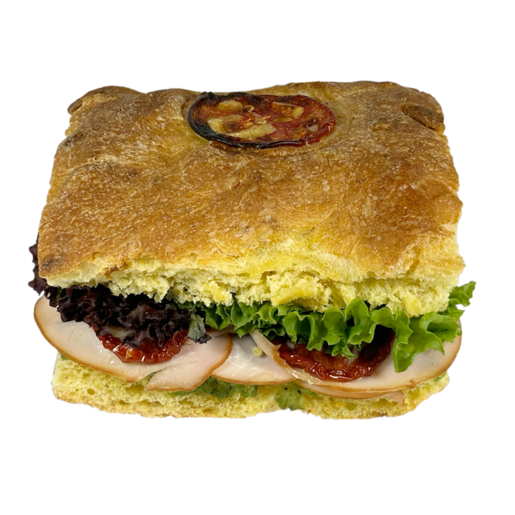 بیکن بوقلمون، پنیر پستو، کاهو فرانسوی، گوجه خشک طعم دار شده و نان فوکوچیا با خمیر ترش چند ساله به همراه روغن زیتون، رزماری و ادویه مخصوص و ... همراه سس دودی و چیلی تای